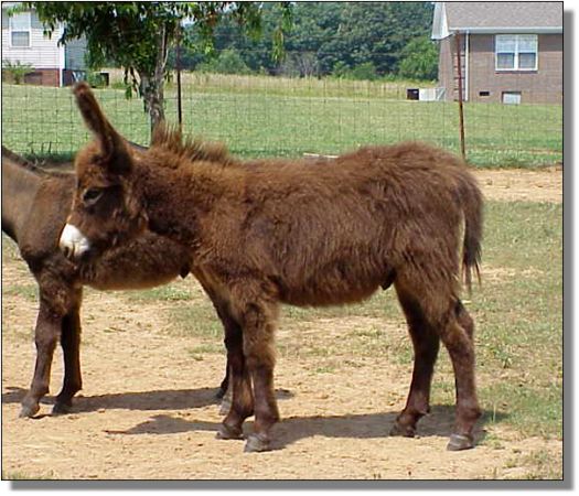 Mary felt really sorry for me so she let me keep Holly for one more year to try again for a jennet foal. We both just love those "My World" bloodlines and since our other good friend (Loretta) will hardly part with her sorrel jennets I was really praying for a jennet this second time. Well, yes, wouldn't you know out pops another jack foal. I was talking to my great friend, Julia, and I told her that Holly had her baby and it was another dang jack. Julia said, "Doesn't that just chap your a_ _!!" I said, "Yes, and that is what I am going to name him!!" So I am giving up on ever owning a 'My World' jennet for the time being! Chaps is being offered for sale as a pet quality gelding only due to the fact that his front legs are not perfectly straight. His legs are sound and they will not effect him in anyway as a pet or driving donkey. I love geldings but I also like to show and the geldings have gotten so competitive in the show ring now that they need to have outstanding conformation to stand up to the present competition. This is a wonderful sign of how miniature donkeys are progressing! Chaps can have a wonderful life as a beloved family pet and can be your chance to own a donkey at a bargain price to see if this is the pet for you and your family!