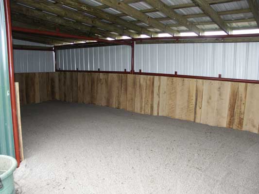 Front wall to be added with kickboards, metal hung all around..removeable vinyl strips hung in the door for warmth in the cold winter months, then the quarterdown will be spread to prevent mud...and finally donkeys will be added! 11/18/2004...had to stop work to have 6 donkeys ready to go to their new homes but today we added the front kickboards!!