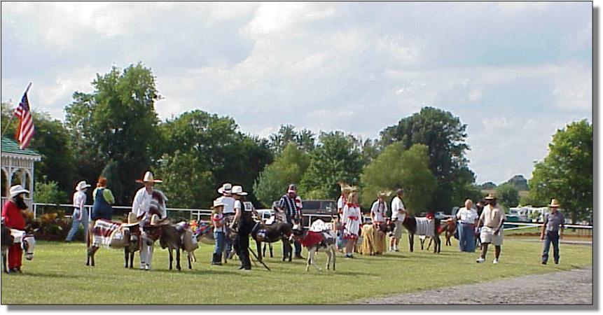 Other winners not shown here due to my running out of disk space on my camera...forgive me!! I will be happy to post your photos if you will send them to me. Congratulations to LJ & Deby Mix showing their spotted jack Sampson and winning the Jacks at Halter Class and placing 1st and 2nd in the lead race with LJ and Deby out of 14 entries. Debi and LJ also placed 2nd and 3rd in the Weanlings/Yearlings at Halter. Teresa Pucket won 1st in the Panty Race out of 15 entries, 2nd in the driving class, 2nd in Musical Buckets, 3rd in the Coon Jump, and so many more ribbons that I could not keep up with it but she and her donkey, Patches, won High Point of the whole show...winning a trophy, ribbon, cash, and a wonderful show halter donated by the The Lil' Longears Ranch! Bob & Sandy Dorris were 2nd in the Egg & Spoon race working as a team, Bob was 3rd and Sandy was 5th in the Panty Race. Sandy was 3rd in Musical Buckets. Thanks, Sandy, for your help in the Musical Bucket race ... without it I would not have won!! I was too out of breath for the rest of the show to thank you properly for helping us beat our husbands!! Sandy Carlson was 2nd in the Jacks at Halter class with her spotted jack, Triple C Hermes. They also placed 4th in the Lead Race. Sandy and her spotted jennet, Clementine, won the Jennets at Halter class. Good going Sandy!! Kay Allen and her spotted jack 5th in the large Weanlings/Yearlings at Halter class and her granddaughter, Kendall, was 2nd in that packed Costume Class in their very first donkey show! Please send photos and updates on our other winners and I will post them here! And forgive me if I have made mistakes or left anyone out...send me an E-Mail and I will post additional information. A big THANK YOU to Sandy and Carson Carroll for organizing this show and doing such a wonderful job. A special thank you to the announcer, The Rev. Glen Forsee of the First Assembly of God Church in Shelbyville, for not only doing such an amazing job but especially for telling a joke while I caught my breath sitting on a bucket in the Musical Buckets class. Now THAT is what I call a mini-divine intervention! I think he recognized that I was about to die!! Another big thank you to our judge, Coach Thomas Holman, the PE teacher at Cascade Elementary School. He did a fine job and everyone was happy with his judging decisions. It was a tough job!! Thanks to the Ribbon Girls, Jenna and Sara Edwards, for giving all our show photos a touch of class! We would also like to thank the Bedford County Fair officials...we had fun and we will be back!! |